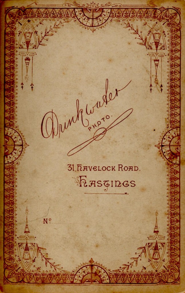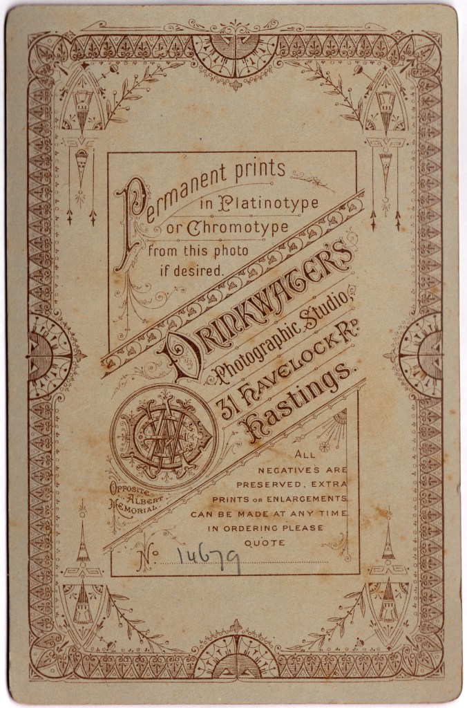 During the first couple of years at his Havelock Road studio, William Drinkwater produced cabinet cards with a blank back, with only a hand-written negative number inscribed on the reverse of the photographic portrait. Once he was established at his Hastings studio, Drinkwater utilised printed trade plate designs on the reverse of his photographs. By 1891, William Drinkwater was incorporating publicity within the central panel of his decorative trade plate design, giving details of the services he offered (e.g. enlargements) and the different types of photography he could supply (e.g. “Permanent Chromotypes”).