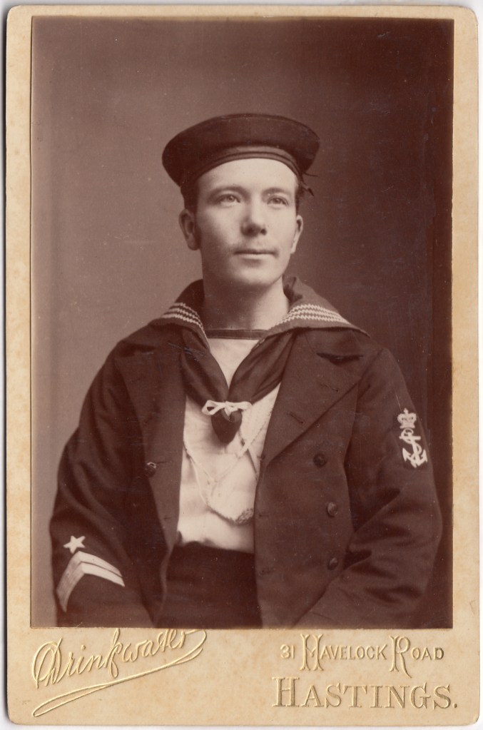 Portrait of a Leading Seaman in the Royal Navy by W. E. A. Drinkwater of 31 Havelock Road, Hastings . Cabinet Card. Negative No.11554. (c1889). Permanent Chromotype.