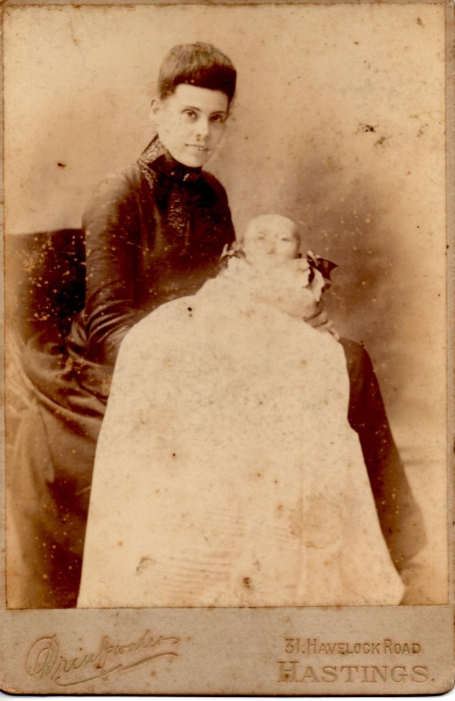Portrait of a young woman holding a baby. This cabinet card was found in the Drinkwater photograph collecton but the woman has not been identified. Photograph by W. E. A. Drinkwater of 31 Havelock Road, Hastings, Sussex (circa 1890). PHOTO SOURCE; Stephen Hudson.