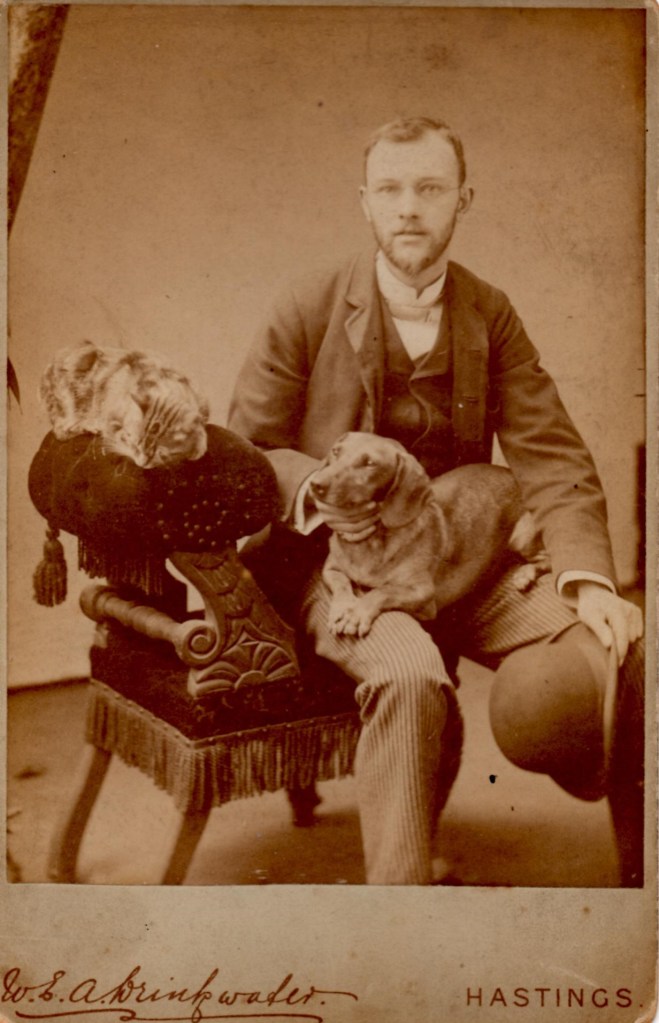 The photographer William Edwin Alexander Drinkwater pictured with his pet cat and pet dog. Cabinet card by W. E. A. Drinkwater, 31 Havelock Road, Hastings (circa 1892). PHOTO SOURCE: Stephen Hudson