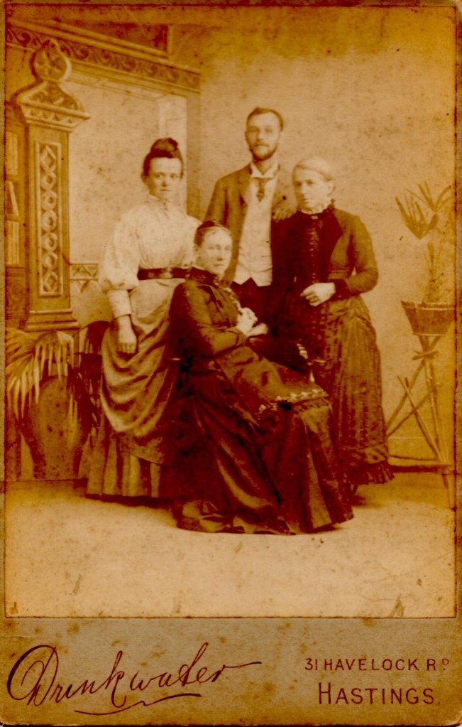 William E. A. Drinkwater pictured with his wife, Martha (left), his mother-in-law, Mrs Janet Funnell (right) and a seated woman, believed to be William’s mother, Mrs Sarah Anne Drinkwater. Cabinet card photograph by W. E. A. Drinkwater of 31 Havelock Road, Hastings. (c1889). PHOTO SOURCE: Stephen Hudson